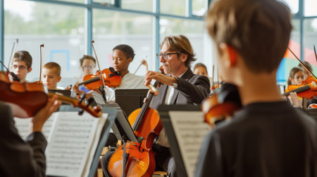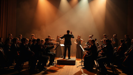 A conductor leads an orchestra in a performance on a stage, showcasing their musical talent and coordination.