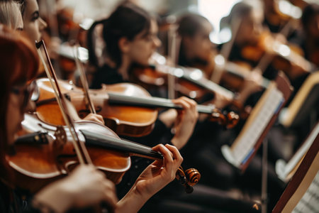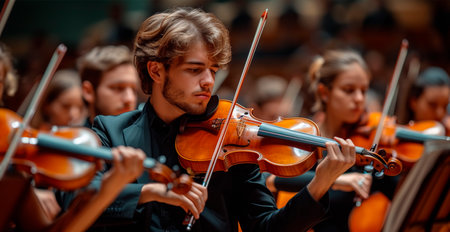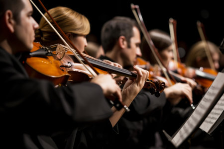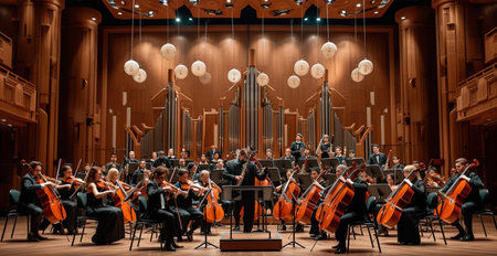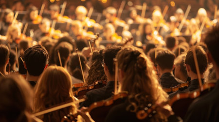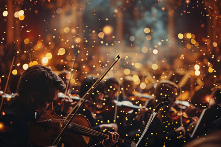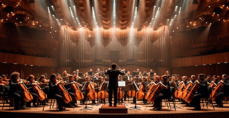 A skilled conductor leads a talented orchestra, filled with musicians passionately playing strings, creating an enchanting atmosphere in a beautifully lit concert hall.
