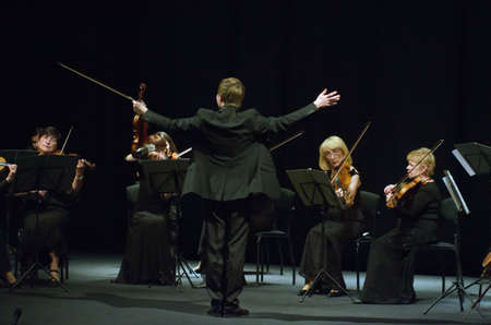 DNIPROPETROVSK, UKRAINE - MAY 14: Famous violinist Ostap Shutko and members of the Symphony Orchestra perform at the State Russian Drama Theatre on May 14, 2015 in Dnipropetrovsk, Ukraine