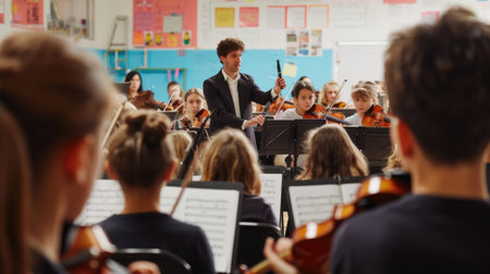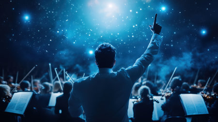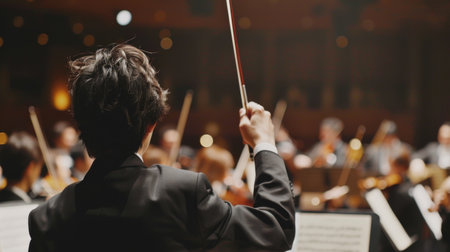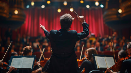 A conductor standing in front of an orchestra, holding a baton and directing the musicians. The orchestra members are focused on the conductor, following their cues to create harmonious music together.