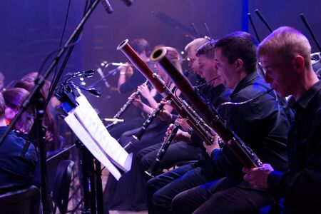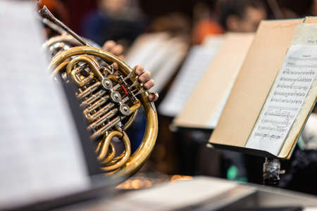 Tyumen, Russia - January 25, 2017: Concert of orchestra of the Tyumen philharmonic hall for photographers. French horn players