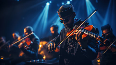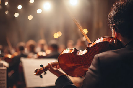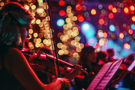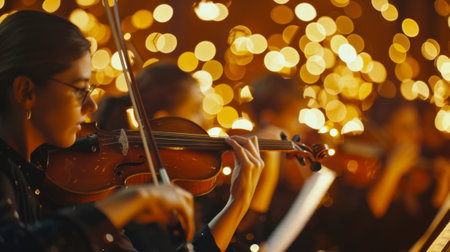 A skilled violinist passionately plays amid ambient glow, with a softly blurred crowd and ensemble creating an intimate concert atmosphere.