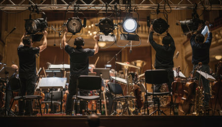 Medium shot of stagehands setting up lighting fixtures above the orchestra pit with the pit chairs and instruments softly out of focus during an opera rehearsal.