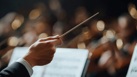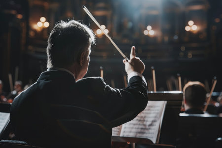 Warmly lit image showcasing a focused orchestra conductor with baton in hand during a classical music concert in an opulent hall.