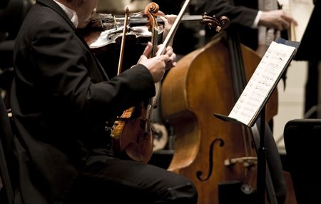 Professional musicians performing classical music concert with symphonic orchestra on stage