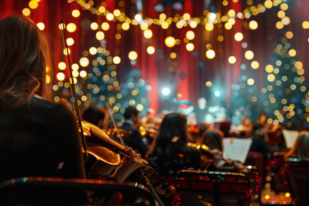 Festive Christmas concert with blurred stage, glowing decorations, and holiday magic.