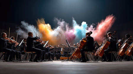 A vibrant symphony orchestra performs on stage, enhanced by a spectacular explosion of colorful powder, creating an expressive and captivating atmosphere.