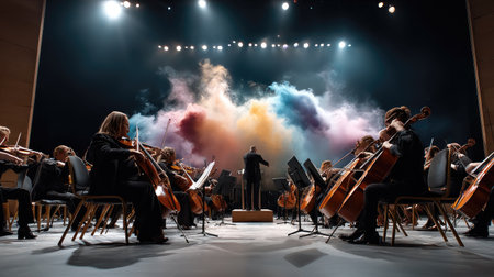 A stunning symphony performance captured on stage, highlighting musicians immersed in their art with colorful smoke effects creating a dramatic ambiance.
