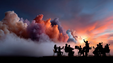 A stunning silhouette of a symphony orchestra performing at sunset with colorful clouds lighting up the sky. This image captures the beauty of music and art in a harmonious blend.