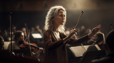 Orchestra Conductor Female Caucasian Mature Leading an orchestra in a rehearsal or performance in Concert hall. Generative AI AIG22.