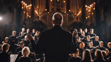 A choir conductor leading a group of singers in harmonized melodies during a concert.
