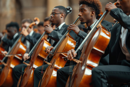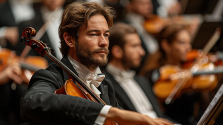 A close-up view of a cellist skillfully playing their instrument during a live classical performance, capturing the artistry and emotion of music-making on stage.