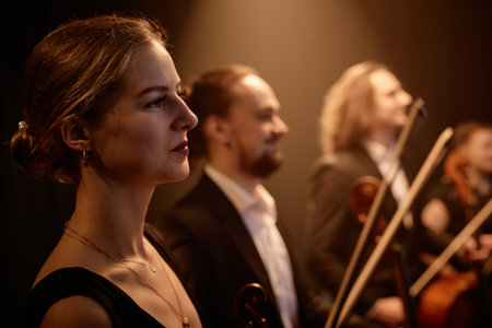 Side view portrait of dignified female violinist standing in row with string quartet receiving applause after performance on stage with warm dim light