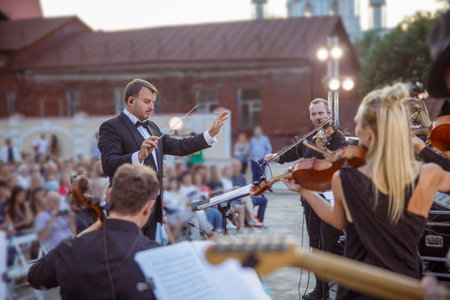ODESSA, UKRAINE - July 16, 2019: Concert of the Andrei Cherny Symphony Orchestra on the theatrical stage of the Odessa Opera House. Musicians of the symphony orchestra perform OSCAR cinematic hits