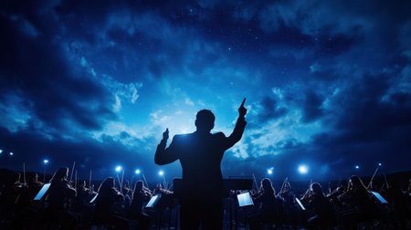 A silhouette of a conductor leading an orchestra under a starry night sky in an open-air amphitheater