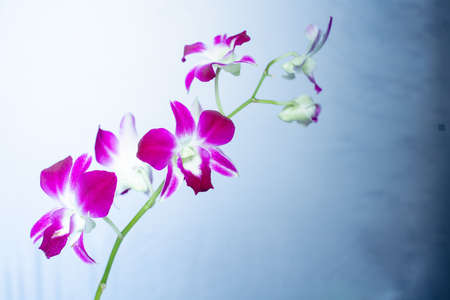 Purple orchid plant blossom close up on blue background