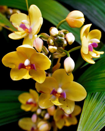 Tropical multicolored оrchid flowers with green branches and leaves on black background. Indoor plants or wild jungle