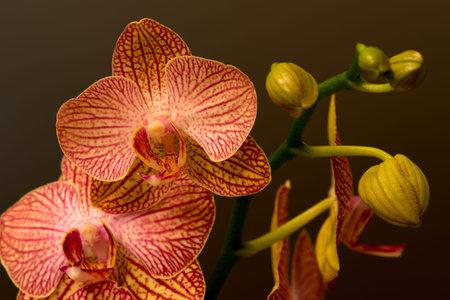 close-up of a blossoming heads of yellow with red lines orchid flowers (ophalaenopsis)