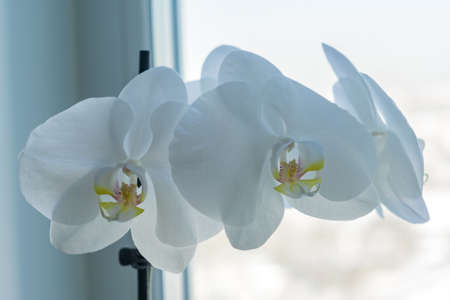 coseup of blooming white phalaenopsis orchid on window sill. House gardening, exotic plant