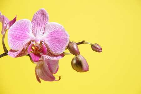 blooming pink orchid flowers on the left side of the image on a yellow background