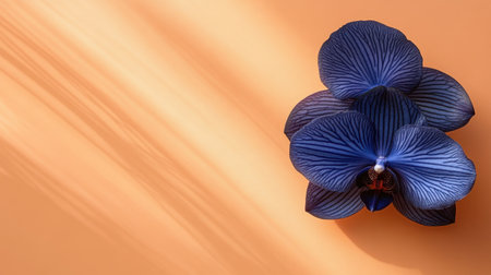 A stunning blue orchid blooms against a warm orange background, creating a serene and elegant atmosphere with soft shadows enhancing its beauty.