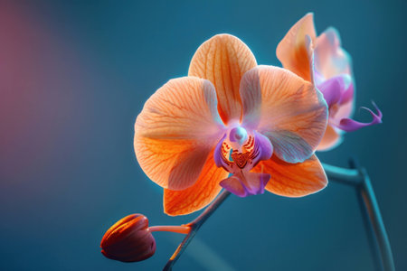 Beautiful orange orchid flower glowing softly against a blue background, showcasing delicate petals and vibrant colors. Perfect for nature and floral themes.