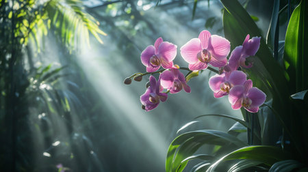 Elegant pink orchids blooming amidst lush greenery, showing vibrant petals and delicate buds, symbolizing beauty and tranquility. Ideal for themes of nature, gardening, and floral intricacy.