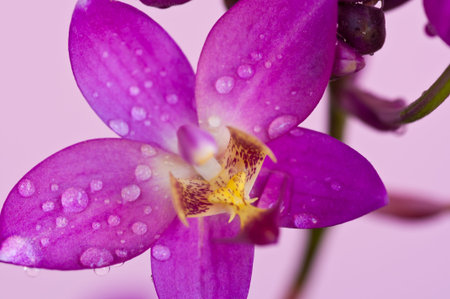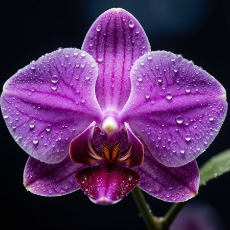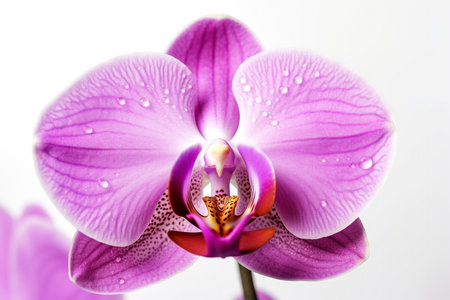 Water droplets on a delicate orchid bloom, showcasing its elegance and fragile beauty