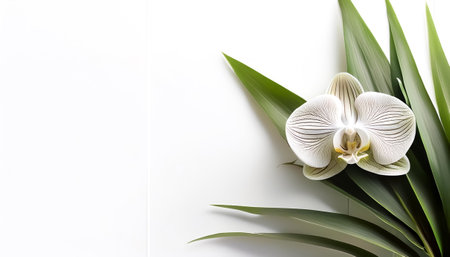 Orchid with leaves pattern on side position provides copy space for text. background concept isolated white