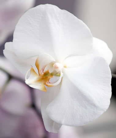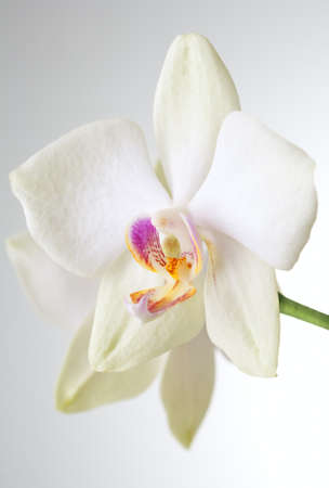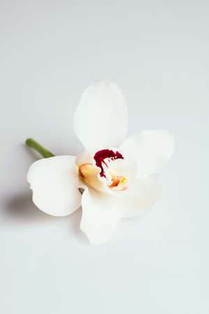 A single white orchid flower on white background, close up. Beautiful phalaenopsis orchid flower for poster, calendar, post, screensaver, wallpaper, postcard, card, banner, cover, website