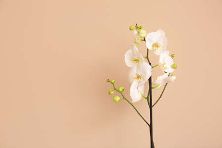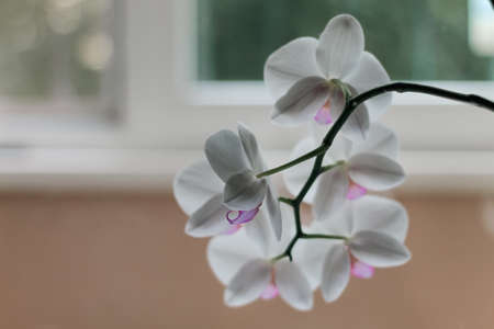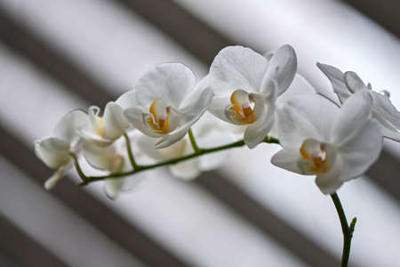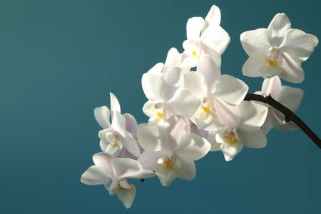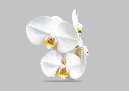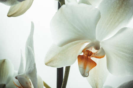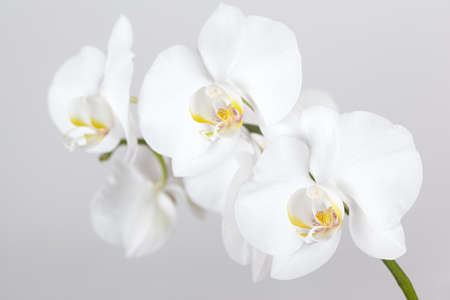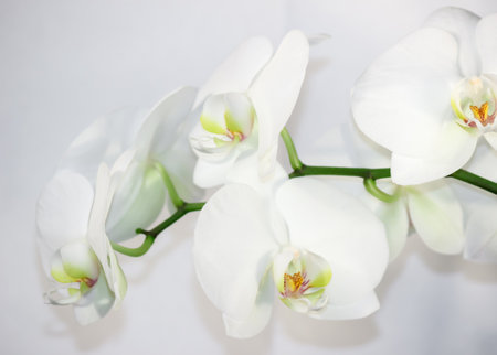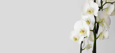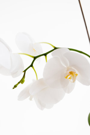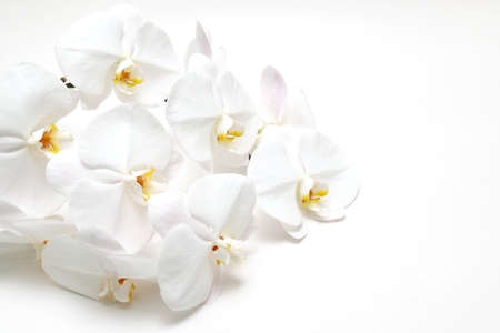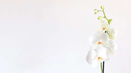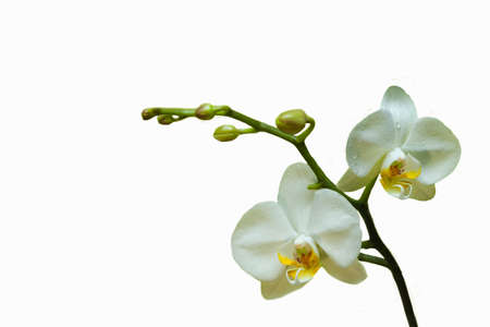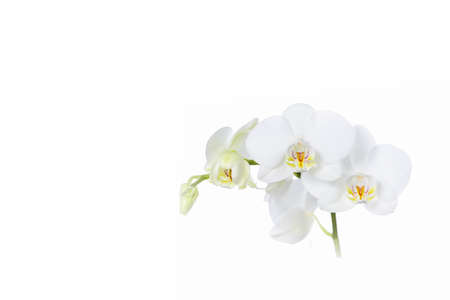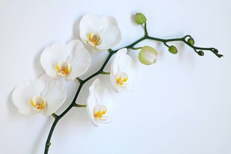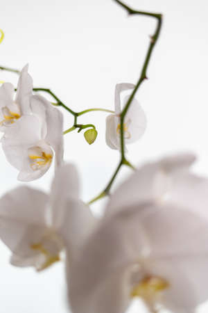 The stem of the Phalenopsis orchid with beautiful white flowers on a white background. Horizontal orientation, selective focus. Copy space.