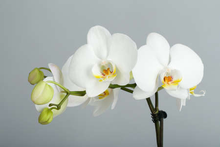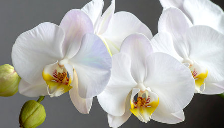 Stunning close-up of white orchids with delicate petals and buds, set against a soft gray background, ideal for floral themes, decor inspiration, and nature-focused projects.