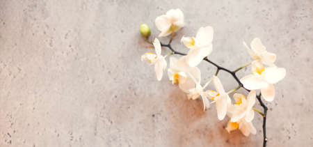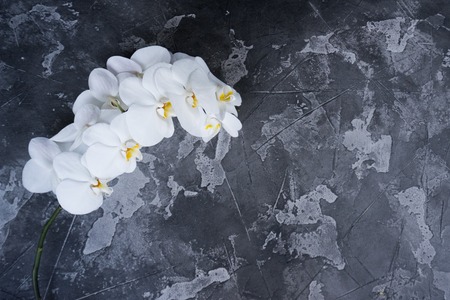 Thin orchid branch with delicate white flowers placed against rough gray stone surface