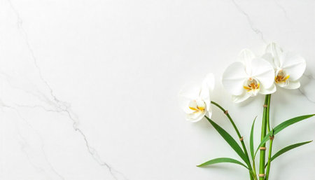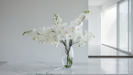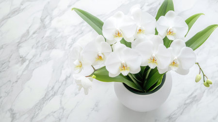 A stunning arrangement of elegant white orchids in a simple white vase, artistically placed on a beautiful marble surface. Perfect for enhancing any interior space.