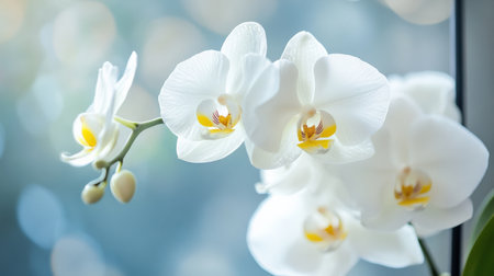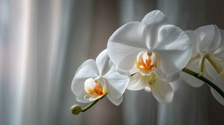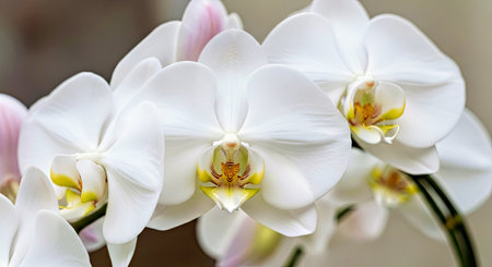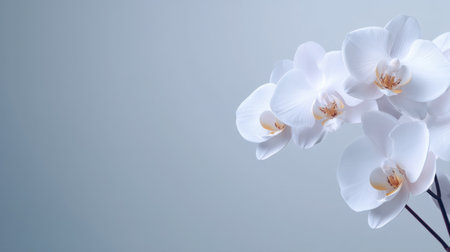 A stunning arrangement of white orchids against a soft gray background, ideal for floral d