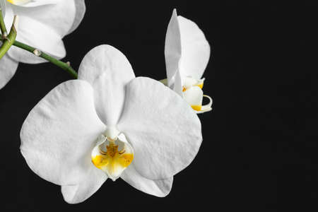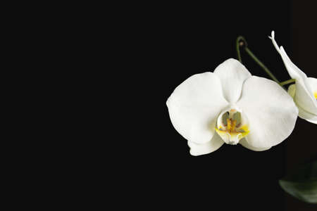 Large lovely white orchids on a black background. Copy space, stylish minimalistic image for postcard banner.