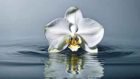 Serene water ripples reflecting aceful white orchid Zen tranquility spa relaxation minimalist elegance Abstract background