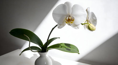 Delicate white orchid blooms create a peaceful ambiance with soft shadows and subtle light, ideal for floral arrangements or elegant home decor projects.