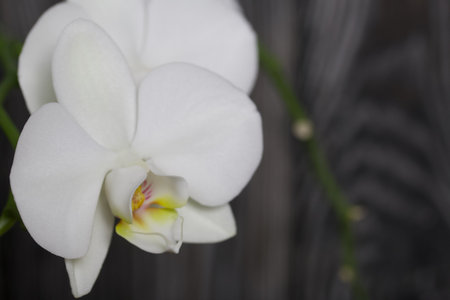 Branch of a white orchid with flowers and buds. Against the background of black pine boards.