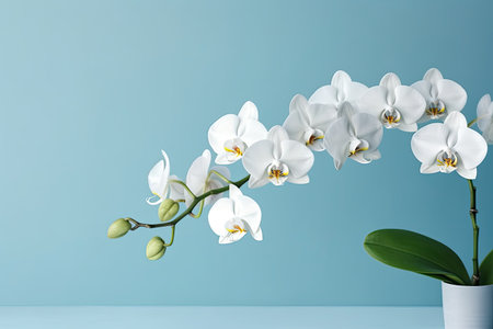 Beautiful white orchids blooming gracefully against a vibrant blue background, showcasing delicate petals and intricate details. Elegant floral composition.