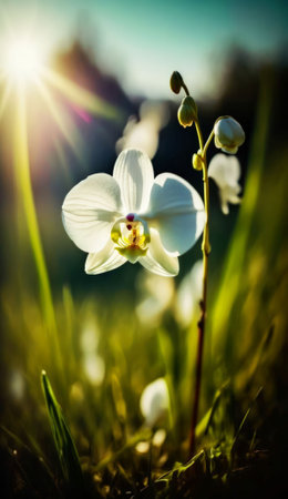 An AI generated illustration of a delicate white orchid blooming in a sunny lush green field