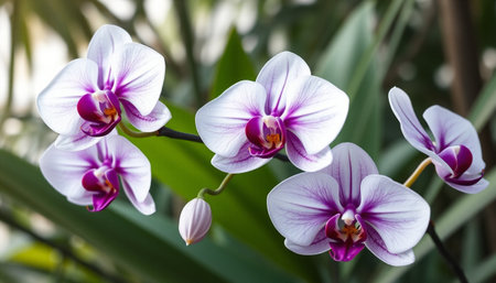 Elegant pink orchids blooming amidst lush greenery, showing vibrant petals and delicate buds, symbolizing beauty and tranquility. Ideal for themes of nature, gardening, and floral intricacy.