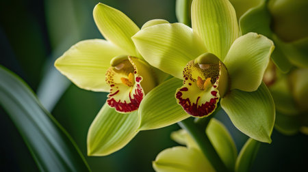 A close-up of Cymbidium orchid, showcasing its rich green and yellow petals with a vibrant red lip