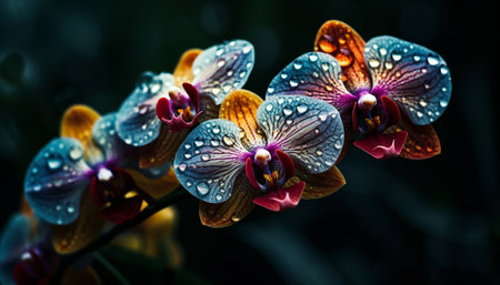 Captivating close-up of an orchid flower showcasing its stunning petals adorned with water droplets, embodying natural beauty and elegance perfect for various uses in photography and art.
