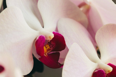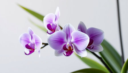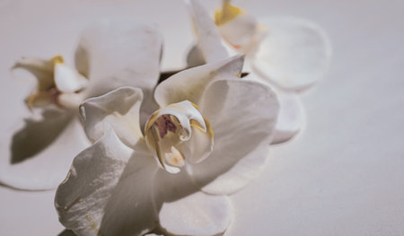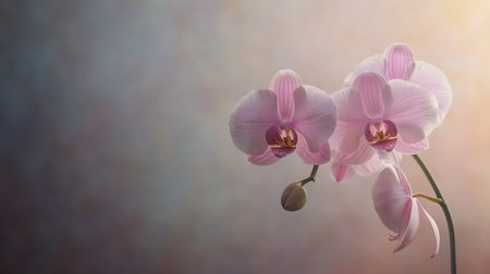 Background showing delicate orchid blossoms in soft pastel hues arranged artfully on a light gray background with subtle shadows and highlights. resolution...