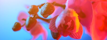 delicate pink Orchid with dew drops close up on blue background in neon light