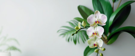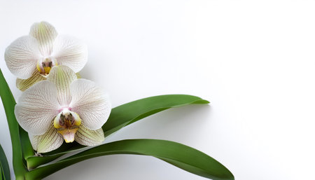 Orchid with leaves pattern on side position provides copy space for text. background concept isolated white