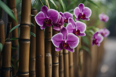 Bamboo Fence with Purple Flowers. Close-Up and Orchids