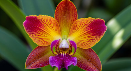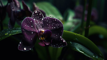 Closeup of orchid tropical plant leaves with rain drops. Green natural backdrop. Generative AI.