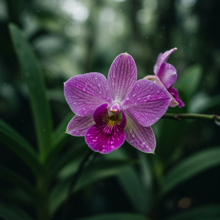 Water droplets on a delicate orchid bloom, showcasing its elegance and fragile beauty